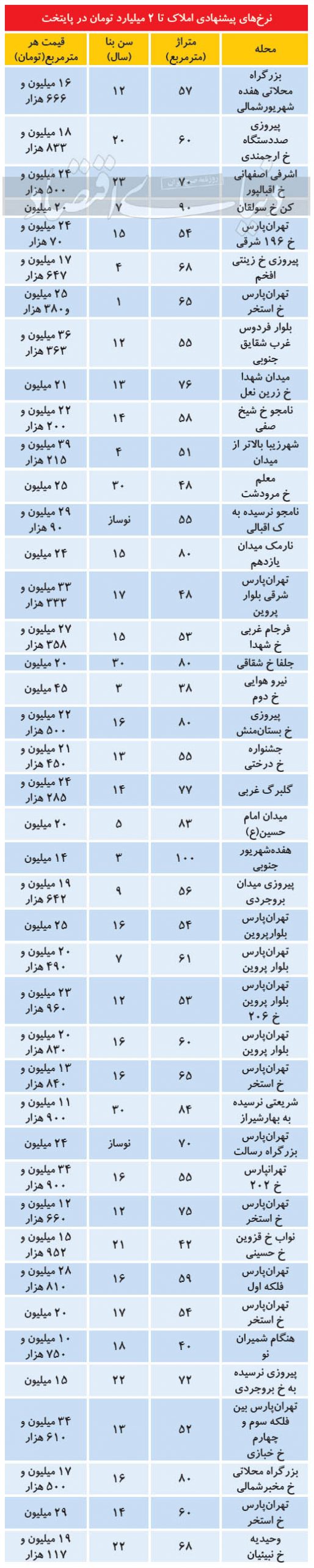 به گزارش پایگاه اطلاعرسانی اتحادیه تعاونیهای عمرانی شهر تهران، تحقیقات میدانی از وضعیت بازار مسکن برای متقاضیانی که سقف بودجه خرید آنها دو میلیارد تومان است، نشان میدهد این املاک در مناطق مختلفی از پایتخت قابل جستوجو هستند. به این ترتیب که متقاضیان این واحدها در مناطق مرکزی، غربی و شرقی میتوانند به جستوجوی ملک در این محدوده قیمتی و کمتر از آن بپردازند؛ هر چند قیمت ملک در برخی محلات قوی در مناطق مختلف بیش از این میزان است. فایلهای مورد بررسی برخی از ملکهای پیشنهادی حاکی از آن است که به طور کلی املاک با قیمتهای دو میلیارد تومان و کمتر از آن در مناطق شرقی بیشتر به چشم میخورد. ضمن اینکه نرخهای پیشنهادی در محدوده یک میلیارد تومان نیز در محلاتی از مناطق مرکزی، شرقی و غربی یافت میشود.