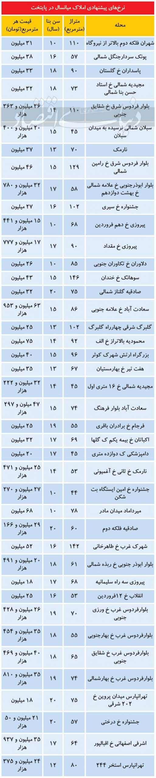 بررسی برخی فایلهای فروش واحدهای مسکونی میانسال که اخیرا از سوی مالکان به بنگاههای معاملات ملکی ارائه شده، نشان میدهد، در شرق تهران، این واحدها بیشتر در محدوده قیمتی ۱۵ تا ۳۵ میلیون تومان به ازای هر مترمربع پیشنهاد شدهاند. این نرخهای پیشنهادی متناسب با نوع منطقه و عمر بنا متغیر است.
